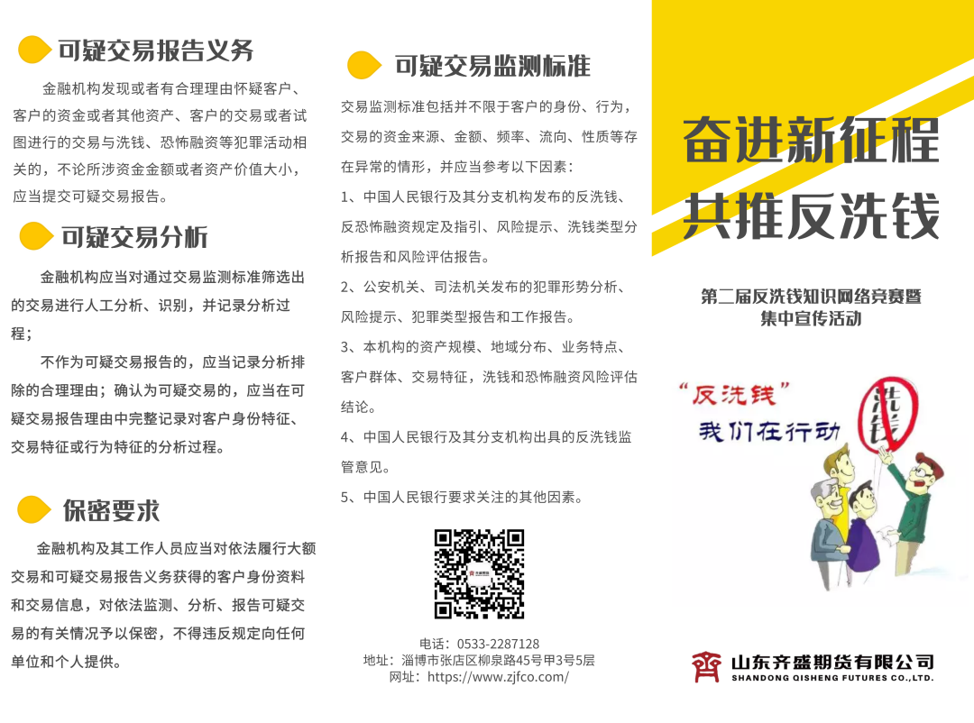 “反洗錢”我們在行動。此次活動,集團(tuán)公司法務(wù)風(fēng)控部聯(lián)合齊盛期貨公司通過多形式、全方位向社會公眾講解洗錢過程、洗錢危害、反洗錢的意義等,以生動的形式向社會公眾展示洗錢案例,向投資者揭示洗錢風(fēng)險,不斷提升了公眾對反洗錢的認(rèn)知,不斷提升了員工反洗錢意識。